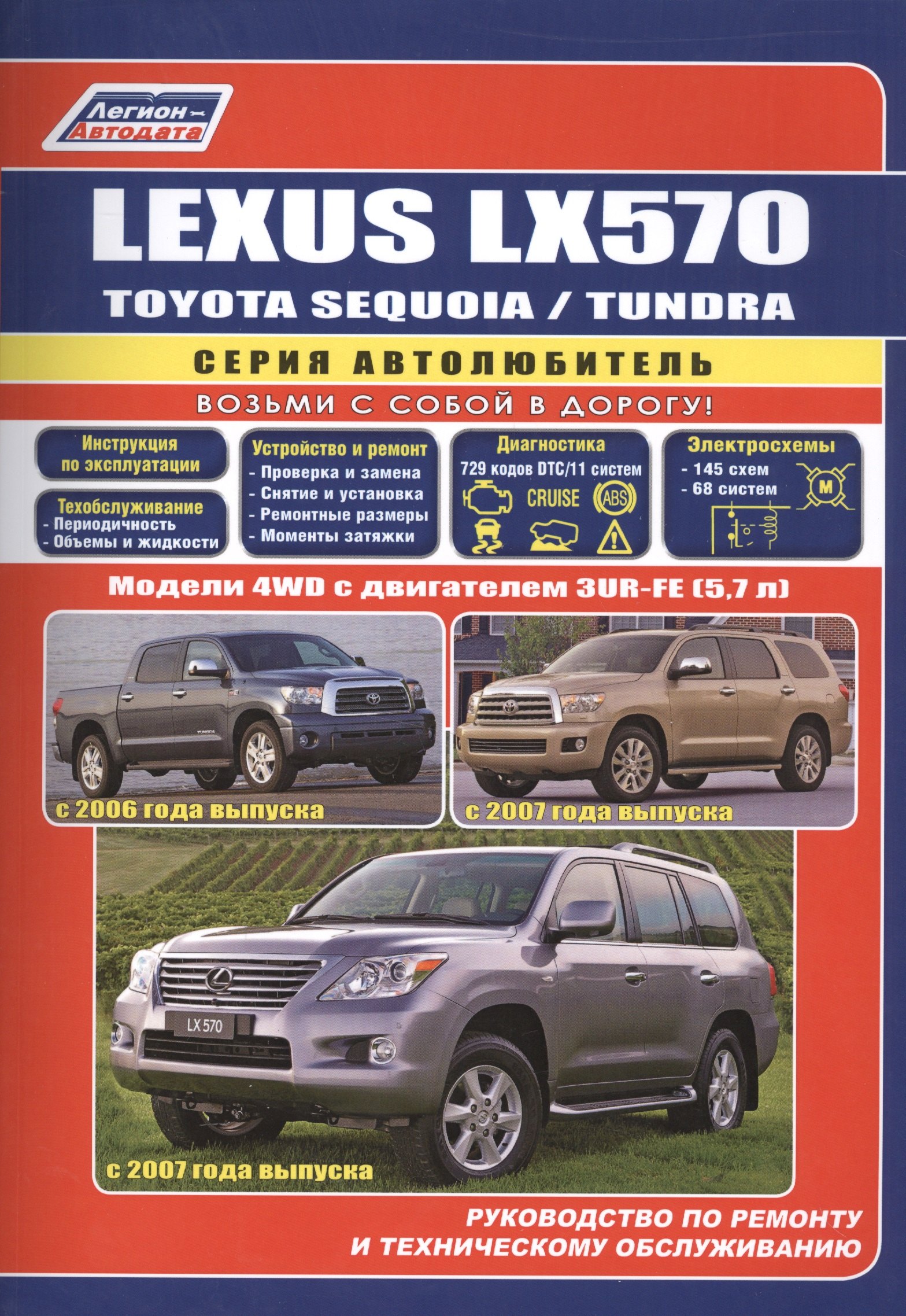 В руководстве дается пошаговое описание процедур по эксплуатации, ремонту и техническому обслуживанию полноприводных автомобилей Lexus LX570 и Toyota Sequoia/Tundra, оборудованных бензиновым двигателем 3UR-FE (5,7 л). .Издание содержит руководство по эксплуатации, описание систем, подробные сведения по техническому обслуживанию автомобиля; диагностике, ремонту и регулировке некоторых элементов систем двигателя (в. т.ч. систем впрыска топлива, зажигания, запуска и зарядки), элементов автоматической коробки передач, раздаточной коробки (в т.ч. системы управления полным приводом), тормозной системы (включая антиблокировочную систему тормозов (ABS), систему экстренного торможения (ВА), систему курсовой устойчивости (VSC), активную противобуксовочную систему (A-TRAC), систему помощи при трогании на подъеме (НАС) и систему помощи при езде по бездорожью (CRAWL)), рулевого управления (включая гидроусилитель и систему изменения передаточного отношения рулевого управления (VGRS)) и подвески (включая систему контроля давления в шинах, активную система управления высотой расположения кузова (АНС) и систему изменения жесткости амортизаторов (AVS)). .Приведены инструкции по использованию самодиагностики системы управления двигателем, АКПП, систем улучшения управляемости автомобиля (ABS, ВА, A-TRAC, VSC, НАС и CRAWL), VGRS, системы контроля давления в шинах, АНС, AVS, системы кондиционирования и SRS. Представлены основные электросхемы различных модификаций автомобилей и описания проверок элементов электрооборудования. .Процедуры проверки компонентов, которые требуют профессиональных навыков и опыта по работе с электронными системами управления, представлены в интерактивной базе данных MotorData.ru. .Приведены возможные неисправности и методы их устранения, сопрягаемые размеры основных деталей и пределы их допустимого износа, рекомендуемые смазочные материалы и рабочие жидкости. Приведены каталожные номера необходимые для технического обслуживания автомобиля. .